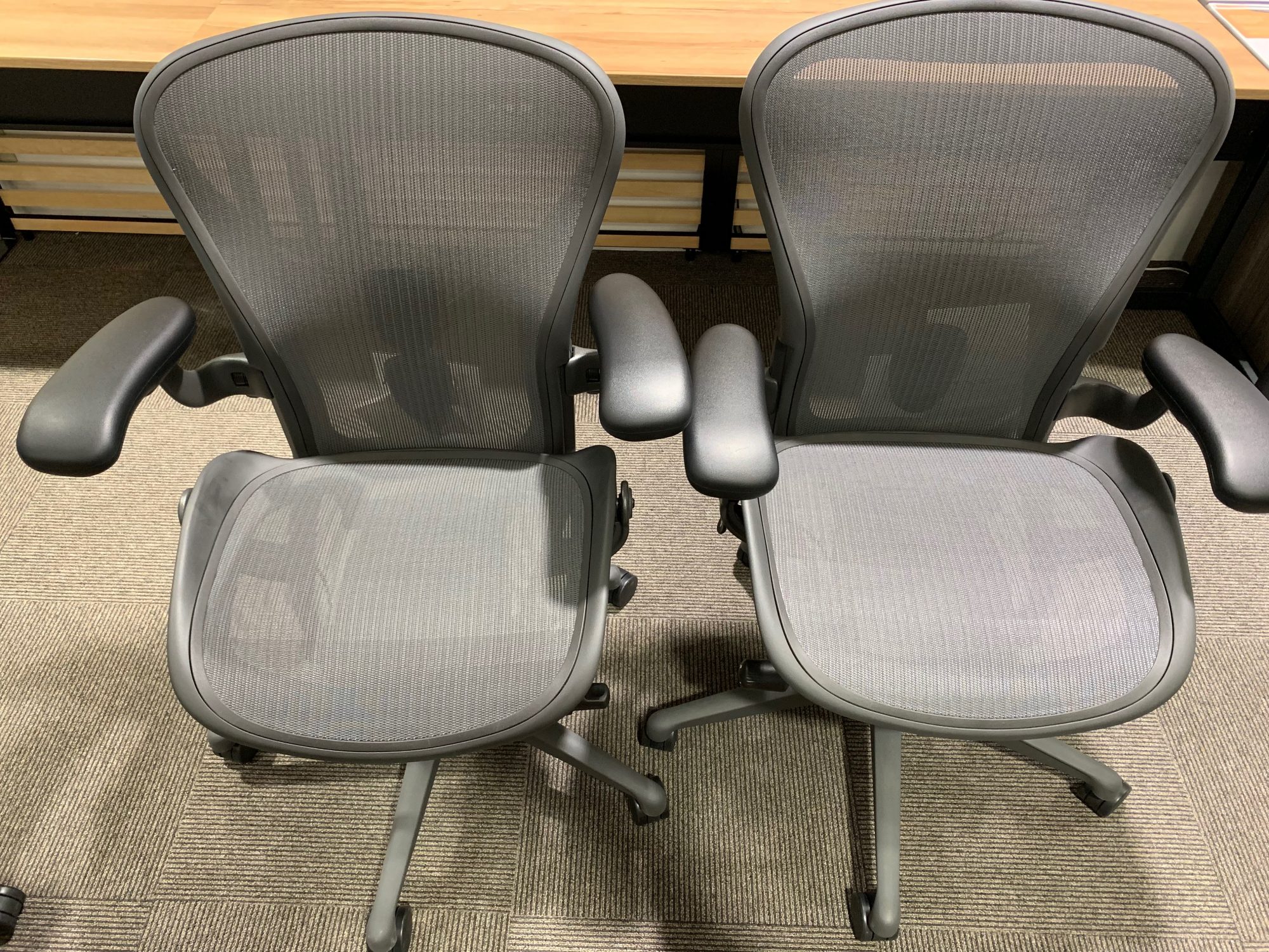 アーロンリマスタードチェアフル装備Bサイズとアーロンチェアリマスタードライト固定肘付きBサイズ、どちらもご用意しておりますので、ご自分でご体感してみてください。
