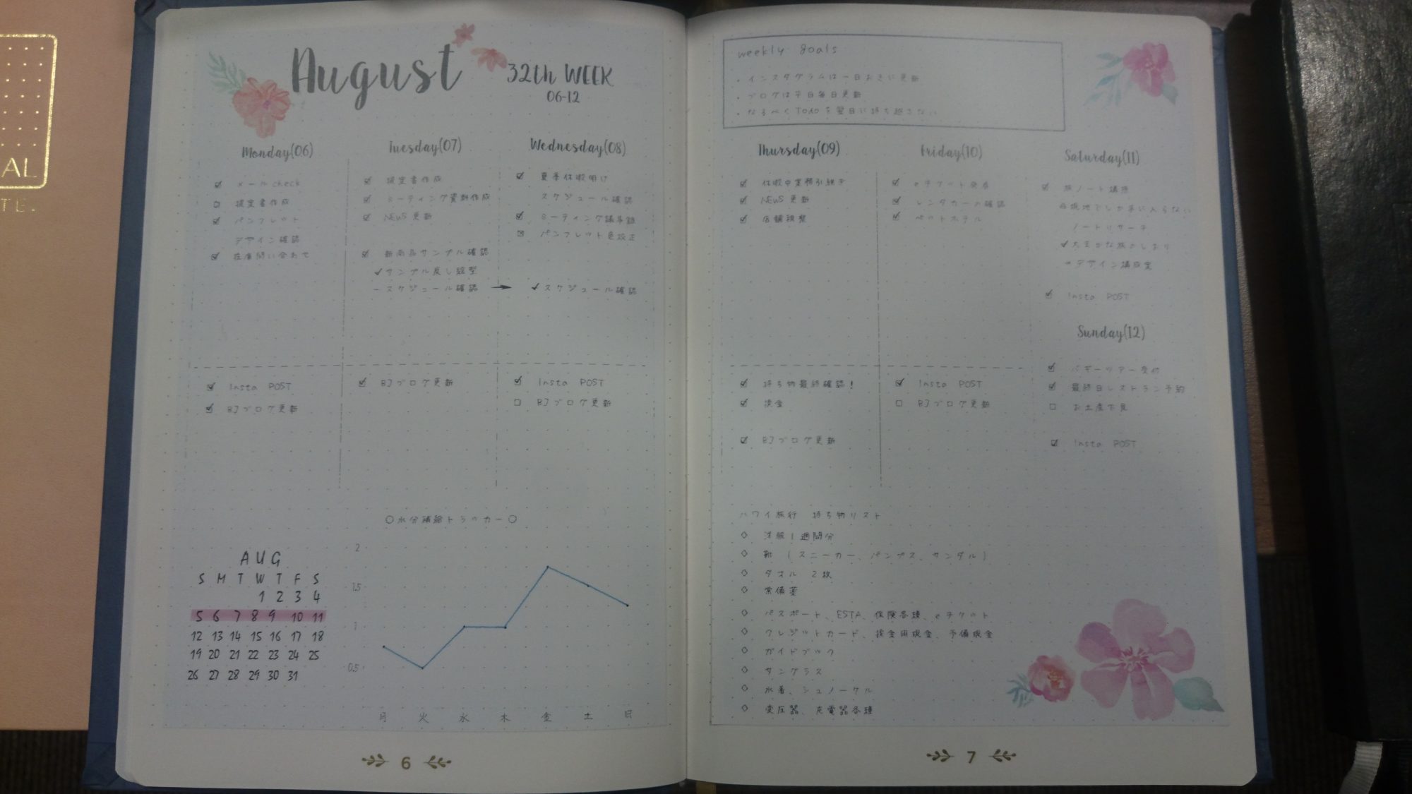 4つ目は、マンスリーログです。マンスリーというその名のとおり、1ケ月分のスケジュールやタスク管理をわかりやすくするページです。書くのが面倒な場合は、便利なマステも発売されてます。
