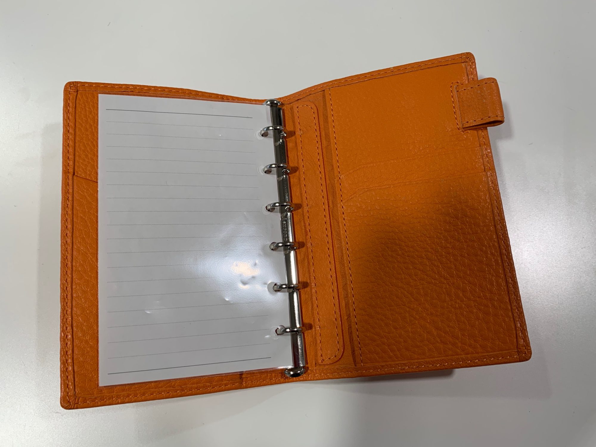 一般にいわれるミニ6穴サイズ手帳です。このシステム手帳は女性のかばんにいれてもばしょをとらずにカラーも女性向きのオレンジやピンクなどのカラーを採用する事でカジュアルな感覚で使いやすく、2冊目のシステム手帳としてよく使われております。