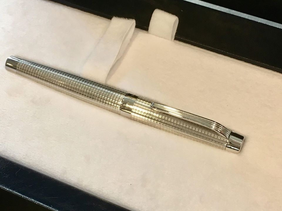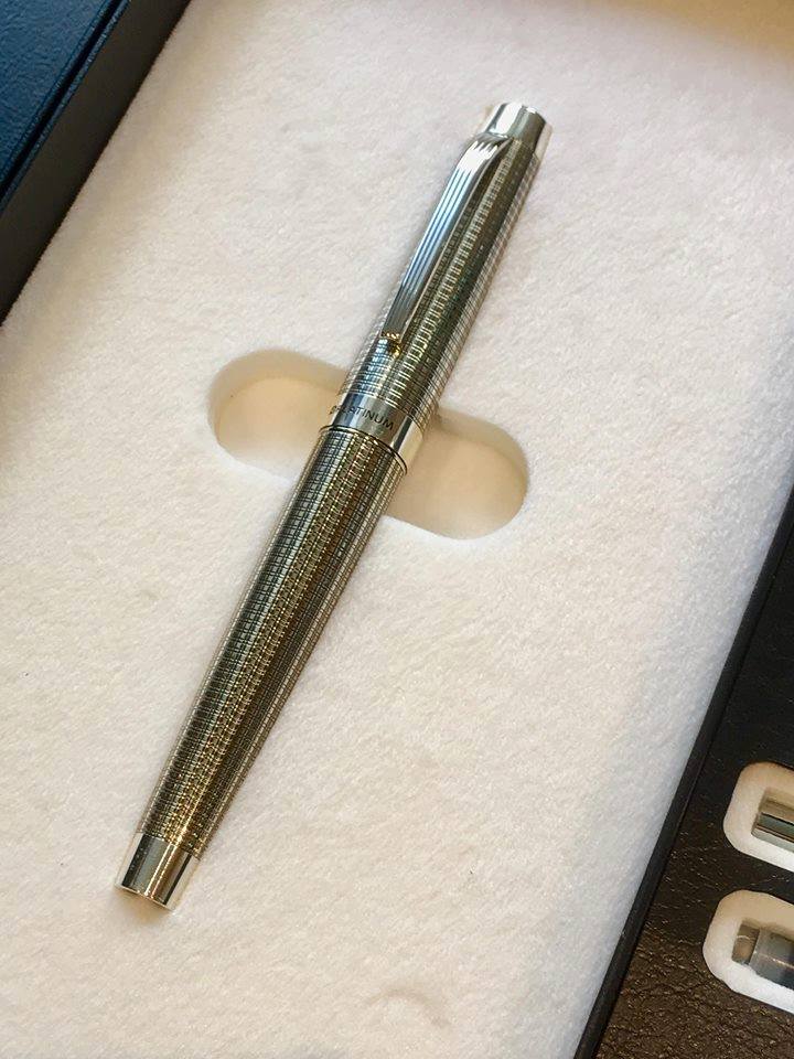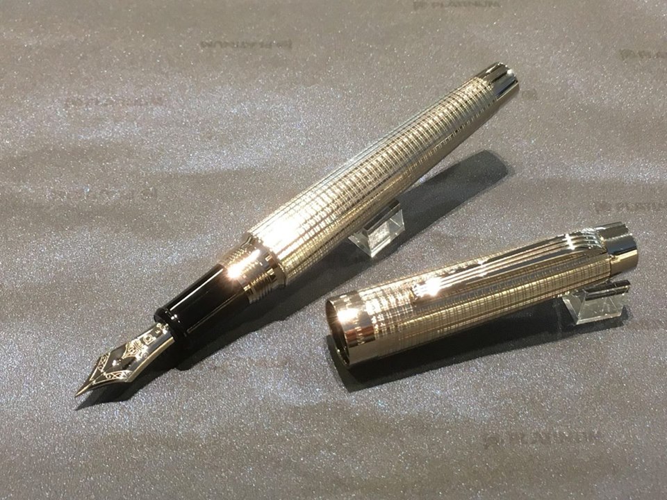 1967年発売の万年筆「プラチナ・プラチナ」をデザインベースとし、銀無垢ボディに装飾技術の粋を極めた二重格子柄をあしらい、さらに柄の溝に墨入れを することで当時の外観を彷彿とさせるスタイルに仕上がりました。ペン先には当社の代表モデルである「#3776 CENTURY」に搭載の14金ペン先ロジウムフィニッシュ 仕様を採用。シルバーボディの持つ優美な佇まいを心ゆくまでお楽しみ頂ければ幸いです。