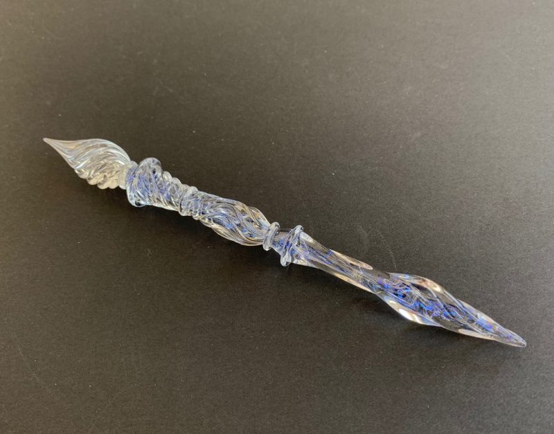 グリップに青色のダイクロガラス、青いガラスのライン、クリアガラスの気泡を内包したガラス材料を使用したガラスペンです。