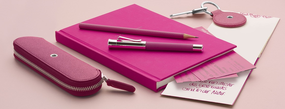 透明感のある深い青色のボディに、金属に柄入れ加工をする時の彫刻の一種である光線彫りの手法を透明軸に施すという手法で、湖面に映る富士山のイメージをモダンに表現しました。