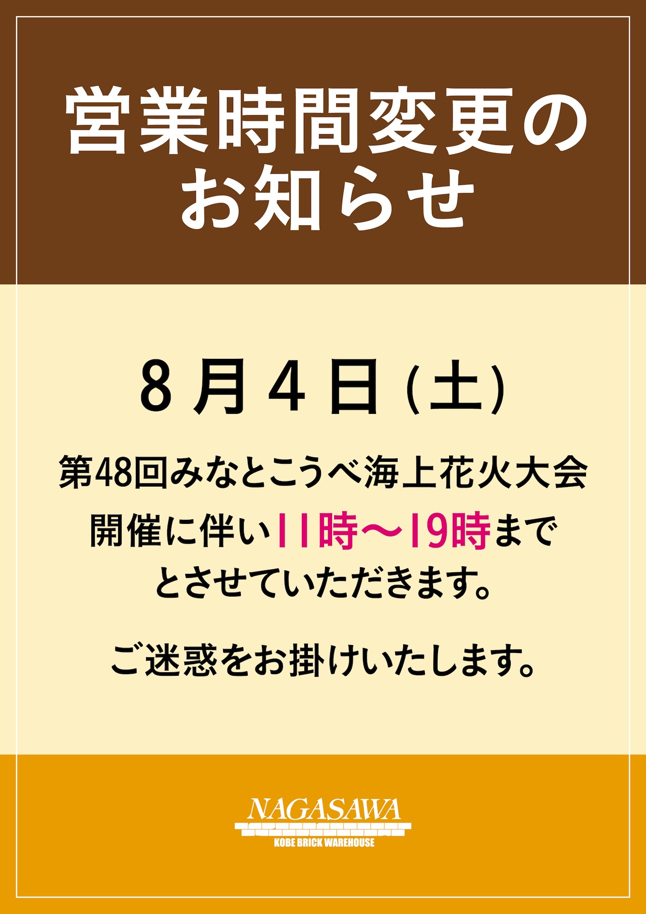 神戸煉瓦倉庫店【神戸煉瓦倉庫店】8月4日みなとこうべ海上花火大会開催による営業時間変更のお知らせ
