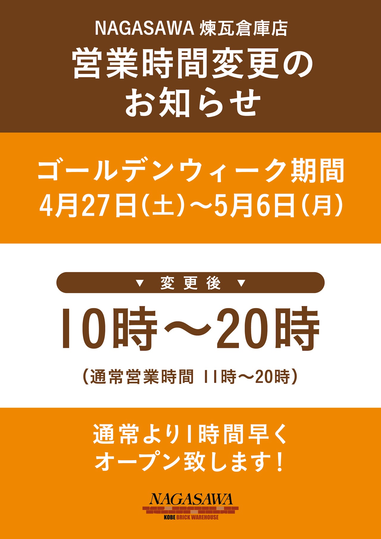 神戸煉瓦倉庫店【神戸煉瓦倉庫店】ゴールデンウィーク期間中の営業時間変更のお知らせ