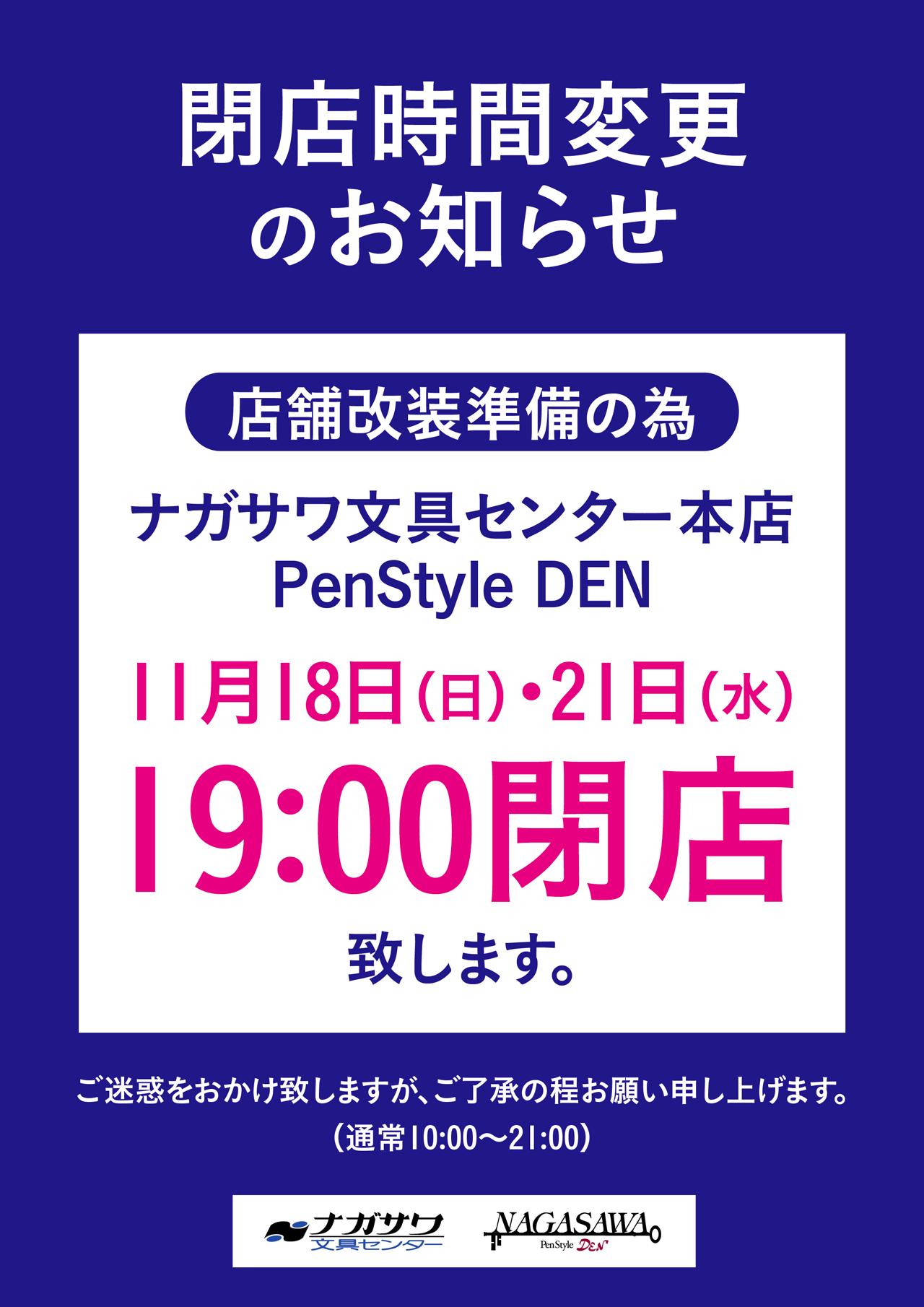 お知らせ【本店・PenStyle DEN】11月18日(日)・21日(水)の2日間 営業時間変更のお知らせ