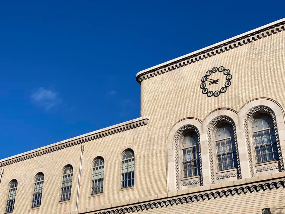 建物正面には特長的なデザインの時計台があり、そこから左右対称に伸びるとても美しいデザインとともに風格のある造りとなっています。