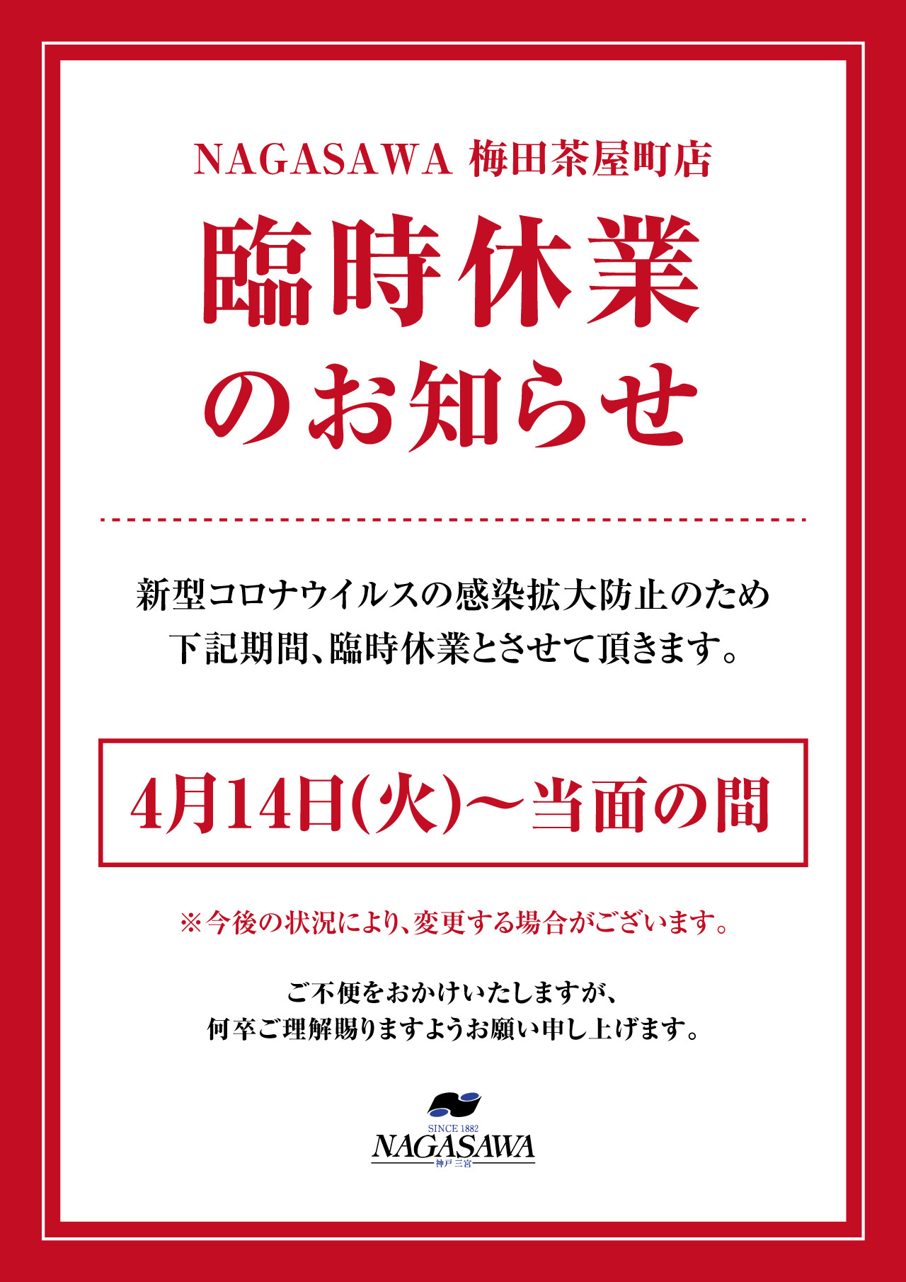 【梅田茶屋町店】新型コロナウイルス感染症拡大予防にむけた営業時間短縮のお知らせ