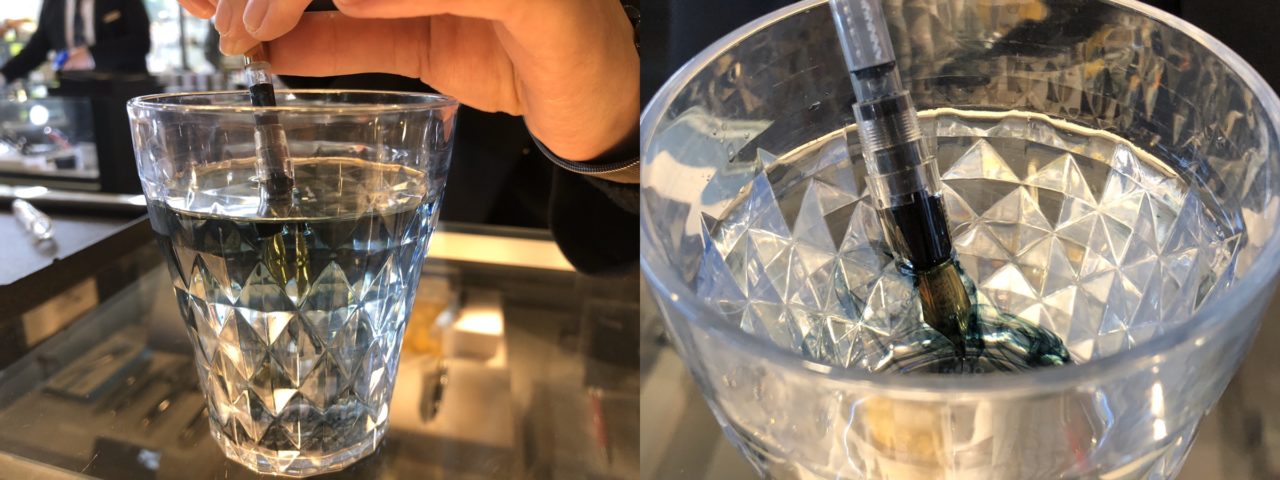 この仕組みを利用して、コップに入れた水にペン先を浸し、コンバーターに水を出し入れするとペン先内部を洗浄することが出来ます。